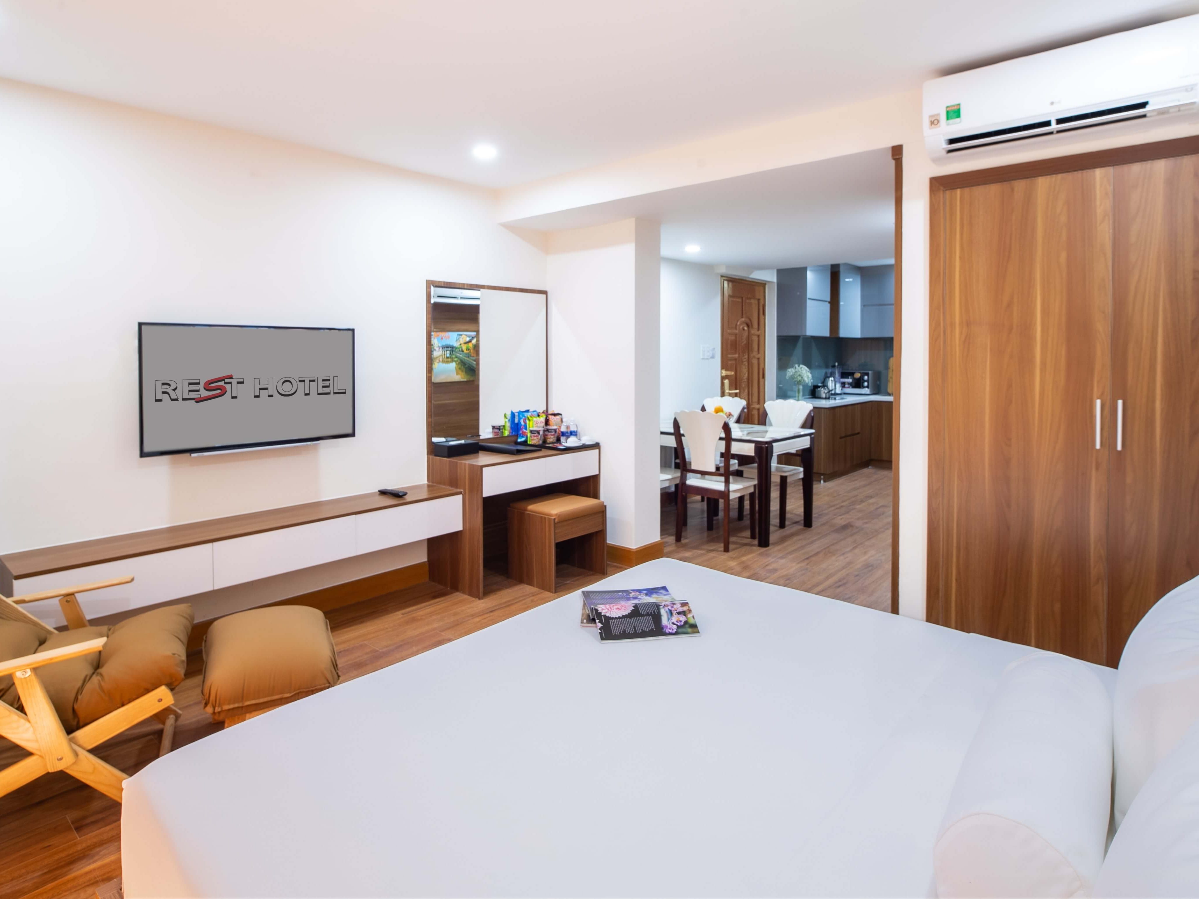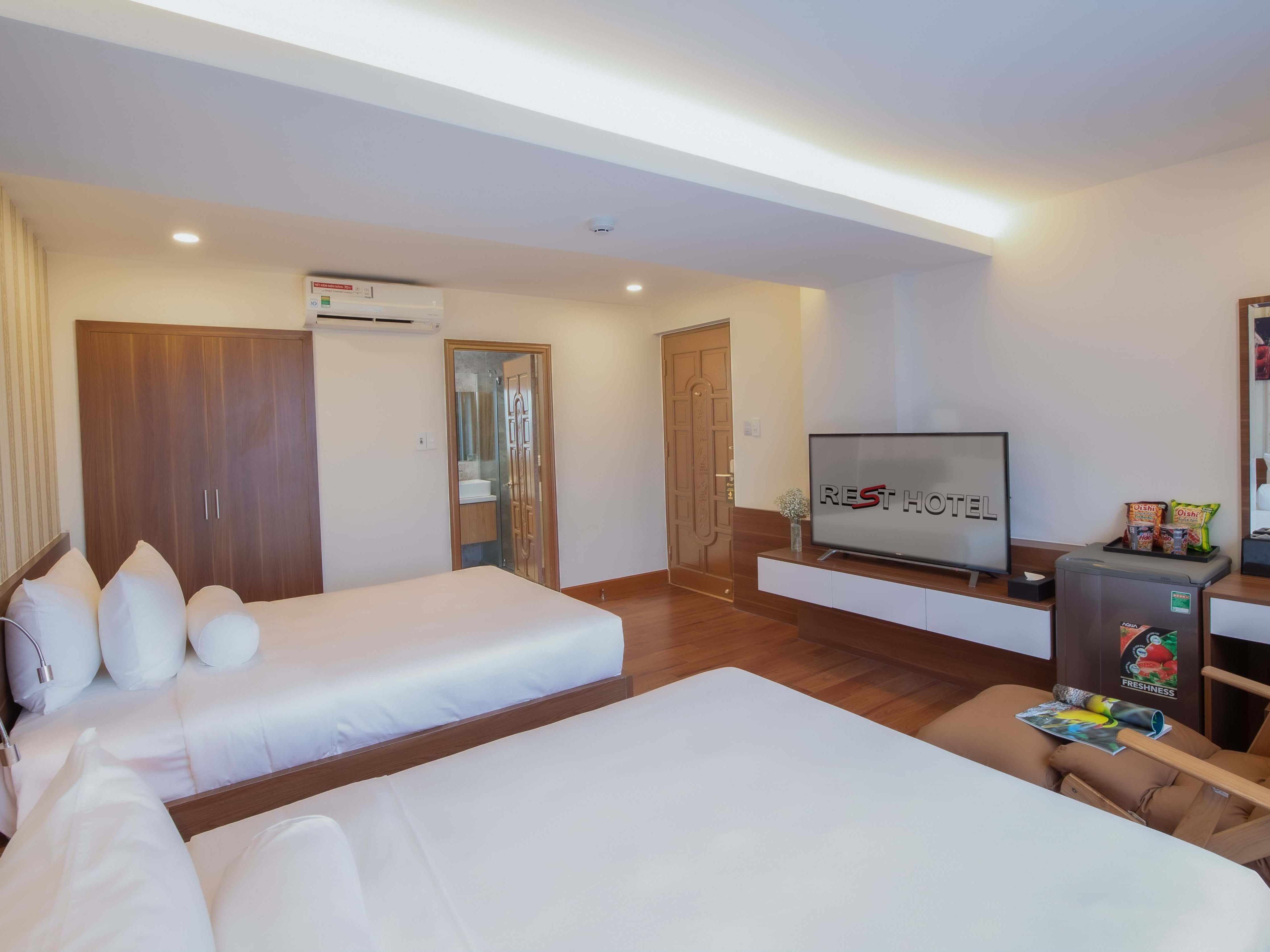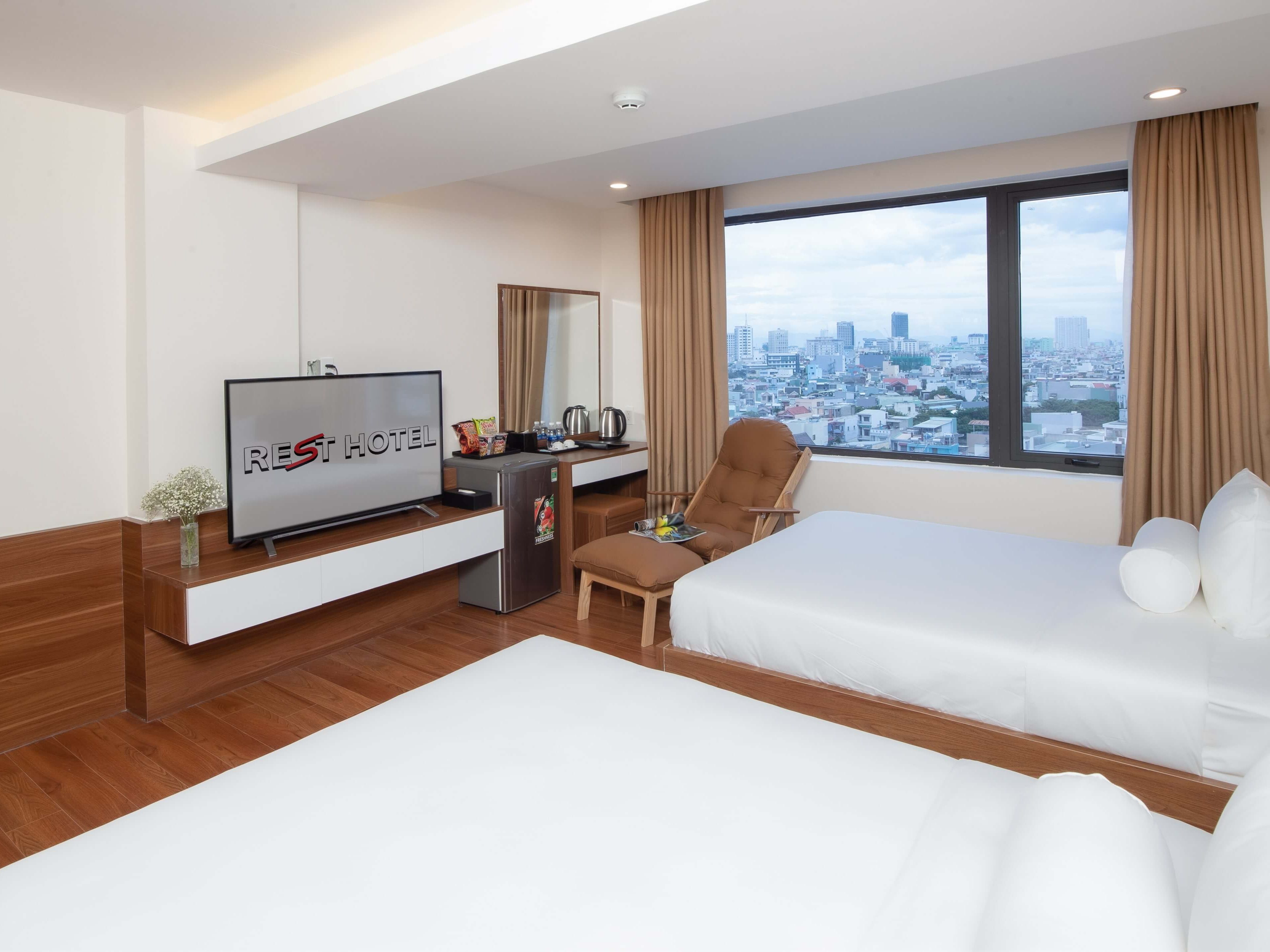 Chỗ ở sang trọng và đẳng cấp tọa lạc trung tâm của Đà Nẵng! Cho dù bạn đang ở đây với chúng tôi để kinh doanh hoặc tận hưởng kỳ nghỉ được chờ đợi từ lâu của bạn, thì với 51 phòng nghỉ hiện đại và đẹp mắt, khách sạn REST cung cấp các phòng với tầm nhìn tuyệt đẹp ra sông Hàn hoặc quang cảnh thành phố luôn chờ đón bạn. Được trang bị bàn làm việc ngăn nắp, giường và nệm thoải mái, phòng tắm riêng trang nhã và các tiện nghi khác, mỗi phòng đều là một thế giới nhỏ để đảm bảo kỳ nghỉ của quý khách trở nên đáng nhớ hơn bao giờ hết. Quý khách có thể nhận phòng và tận hưởng Wi-Fi tốc độ cao miễn phí trong thời gian lưu trú của mình. Hãy khám phá những không gian đáp ứng sở thích riêng của bạn trong suốt thời gian bạn ở thành phố Đà Nẵng tại REST.